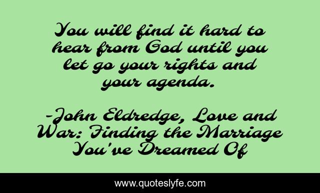 This page presents the quote "You will find it hard to hear from God until you let go your rights and your agenda.". Author of this quote is John Eldredge, Love and War: Finding the Marriage You've Dreamed Of. This quote is about argument, prayer,.