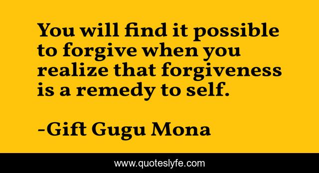 This page presents the quote "You will find it possible to forgive when you realize that forgiveness is a remedy to self.". Author of this quote is Gift Gugu Mona. This quote is about forgiveness, remedy, forgiveness-and-letting-go, forgive, possible,.