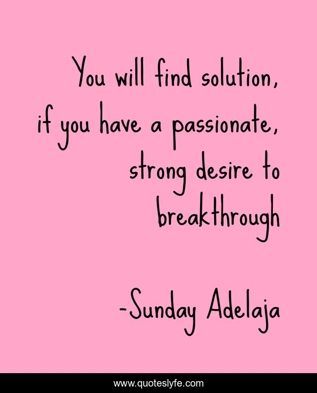 This page presents the quote "You will find solution, if you have a passionate, strong desire to breakthrough". Author of this quote is Sunday Adelaja. This quote is about desire, prosperity, truth-of-life, wealth, success, money, passionate, riches, solution,.