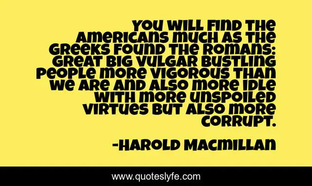 This page presents the quote "You will find the Americans much as the Greeks found the Romans: great big vulgar bustling people more vigorous than we are and also more idle with more unspoiled virtues but also more corrupt.". Author of this quote is Harold Macmillan. This quote is about america, americans,.