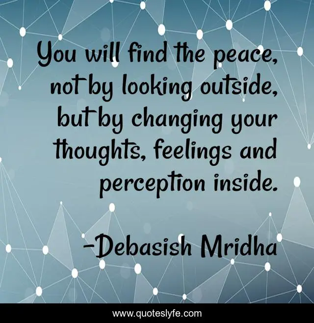 This page presents the quote "You will find the peace, not by looking outside, but by changing your thoughts, feelings and perception inside.". Author of this quote is Debasish Mridha. This quote is about life, love, knowledge, inspirational, intelligence, philosophy, wisdom, quotes, affection,.