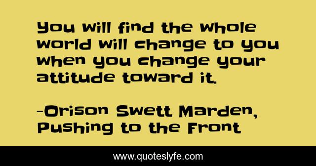 This page presents the quote "You will find the whole world will change to you when you change your attitude toward it.". Author of this quote is Orison Swett Marden, Pushing to the Front. This quote is about world, life, perspective, inspiration,.