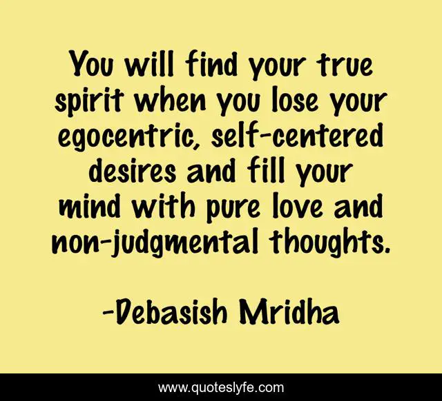 This page presents the quote "You will find your true spirit when you lose your egocentric, self-centered desires and fill your mind with pure love and non-judgmental thoughts.". Author of this quote is Debasish Mridha. This quote is about egocentric, self-centered, non-judgmental, debasish-mridha, quotes, debasish-mridha-md, inspirational, enthusiasm, find-your-true-spirit,.