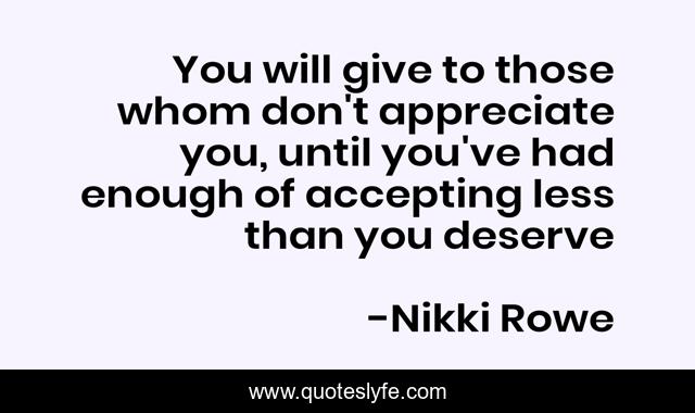 This page presents the quote "You will give to those whom don't appreciate you, until you've had enough of accepting less than you deserve". Author of this quote is Nikki Rowe. This quote is about life, inspire, life-truths, quotes, truth, life-lessons,.