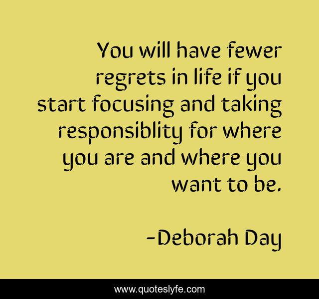 This page presents the quote "You will have fewer regrets in life if you start focusing and taking responsiblity for where you are and where you want to be.". Author of this quote is Deborah Day. This quote is about purpose, meaning-of-life, being-happy, happiness, fulfillment,.