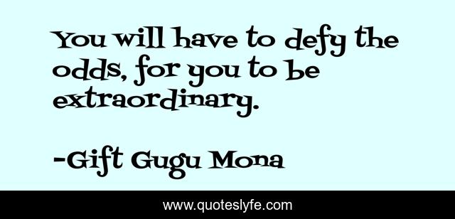 This page presents the quote "You will have to defy the odds, for you to be extraordinary.". Author of this quote is Gift Gugu Mona. This quote is about extraordinary, defy-the-odds, shining-bright, purposeful-living, purpose,.