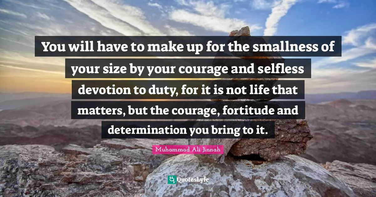 This page presents the quote "You will have to make up for the smallness of your size by your courage and selfless devotion to duty, for it is not life that matters, but the courage, fortitude and determination you bring to it.". Author of this quote is Muhammad Ali Jinnah. This quote is about life, making-a-difference, jinnah, selflessness, courage, inspirational, enthusiasm,.