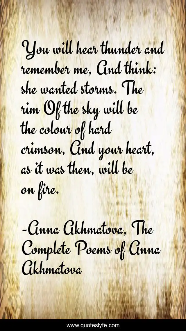 This page presents the quote "You will hear thunder and remember me, And think: she wanted storms. The rim Of the sky will be the colour of hard crimson, And your heart, as it was then, will be on fire.". Author of this quote is Anna Akhmatova, The Complete Poems of Anna Akhmatova. .