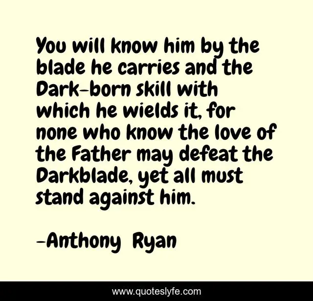 This page presents the quote "You will know him by the blade he carries and the Dark-born skill with which he wields it, for none who know the love of the Father may defeat the Darkblade, yet all must stand against him.". Author of this quote is Anthony Ryan. This quote is about fantasy, prophecy, epic, vaelin,.