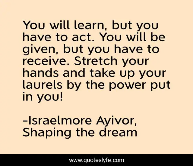 This page presents the quote "You will learn, but you have to act. You will be given, but you have to receive. Stretch your hands and take up your laurels by the power put in you!". Author of this quote is Israelmore Ayivor, Shaping the dream. This quote is about dunamis, food-for-thought, power, gift, give, receive, laurels, hands, actions,.