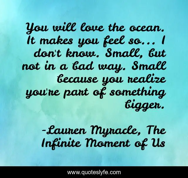 This page presents the quote "You will love the ocean. It makes you feel so... I don't know. Small, but not in a bad way. Small because you realize you're part of something bigger.". Author of this quote is Lauren Myracle, The Infinite Moment of Us. This quote is about water, world, love, affection, ocean,.
