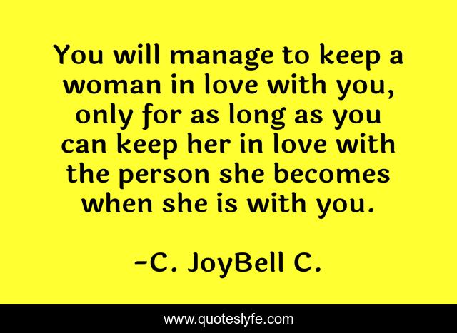 This page presents the quote "You will manage to keep a woman in love with you, only for as long as you can keep her in love with the person she becomes when she is with you.". Author of this quote is C. JoyBell C.. This quote is about life-and-living, women-in-love, nature, nature-of-the-woman, women-and-love, being-in-love, the-love-of-a-woman, about-the-nature-of-women, about-women,.