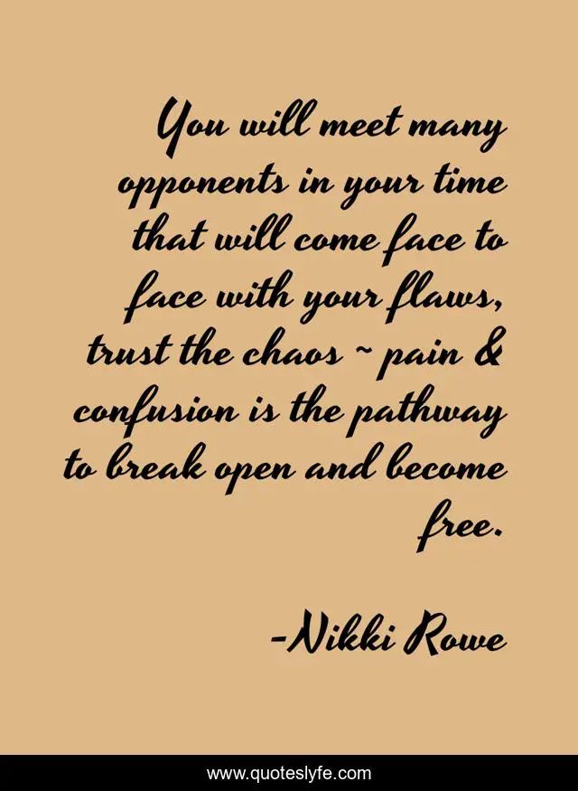 This page presents the quote "You will meet many opponents in your time that will come face to face with your flaws, trust the chaos ~ pain & confusion is the pathway to break open and become free.". Author of this quote is Nikki Rowe. This quote is about courage, admiration, strength, flaws, fate, guidance, chaos, wisdom, know-yourself,.