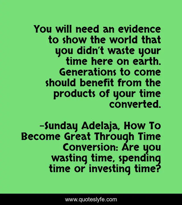 This page presents the quote "You will need an evidence to show the world that you didn’t waste your time here on earth. Generations to come should benefit from the products of your time converted.". Author of this quote is Sunday Adelaja, How To Become Great Through Time Conversion: Are you wasting time, spending time or investing time?. This quote is about life, evidence, earth, conversion, productivity, wealth, greatness, waste, humanity,.
