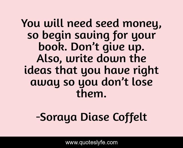 This page presents the quote "You will need seed money, so begin saving for your book. Don’t give up. Also, write down the ideas that you have right away so you don’t lose them.". Author of this quote is Soraya Diase Coffelt. This quote is about aspiring, advice, quotes, writers, future, achieve,.
