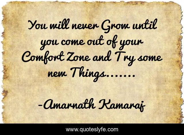 This page presents the quote "You will never Grow until you come out of your Comfort Zone and Try some new Things.......". Author of this quote is Amarnath Kamaraj. This quote is about confidence, lifestyle, success, positive, motivational, optimistic,.