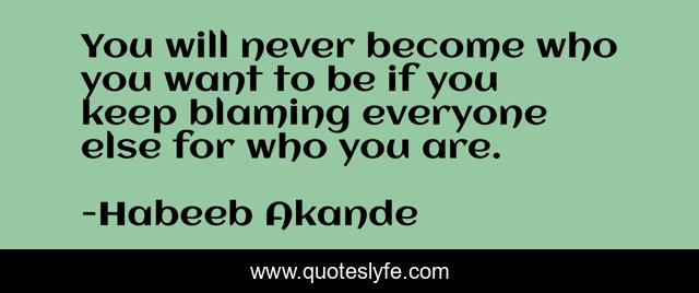 This page presents the quote "You will never become who you want to be if you keep blaming everyone else for who you are.". Author of this quote is Habeeb Akande. This quote is about confidence, positive, motivational, blame, optimistic, inspirational, enthusiasm,.