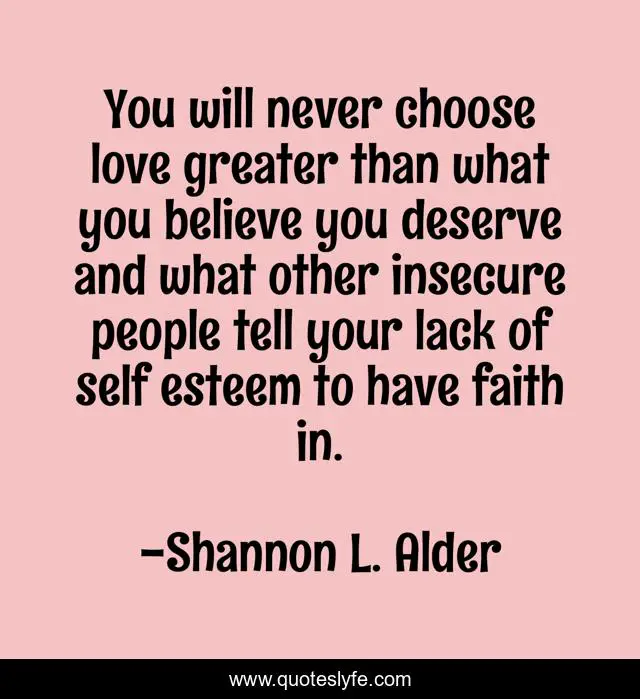 This page presents the quote "You will never choose love greater than what you believe you deserve and what other insecure people tell your lack of self esteem to have faith in.". Author of this quote is Shannon L. Alder. This quote is about self-respect, jealousy, have-confidence, fear, self-love, self-confidence, self-appreciation, religious-guilt, worth,.