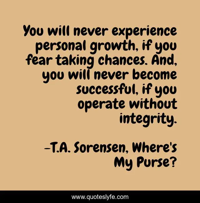 This page presents the quote "You will never experience personal growth, if you fear taking chances. And, you will never become successful, if you operate without integrity.". Author of this quote is T.A. Sorensen, Where's My Purse?. This quote is about ageing, alzheimers, caregiving, health, nonfiction, tribute, dementia, eldercare,.