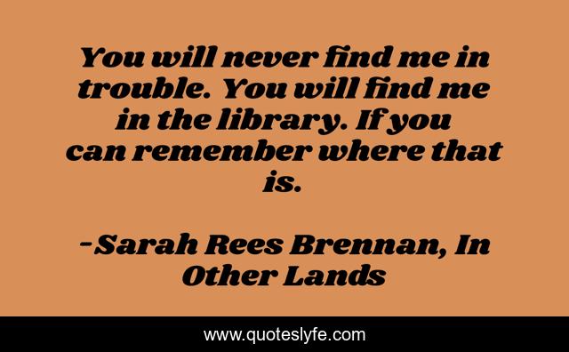 This page presents the quote "You will never find me in trouble. You will find me in the library. If you can remember where that is.". Author of this quote is Sarah Rees Brennan, In Other Lands. This quote is about luke-sunborn, book-lovers, sarcasm, library, snark, elliot-schafer,.