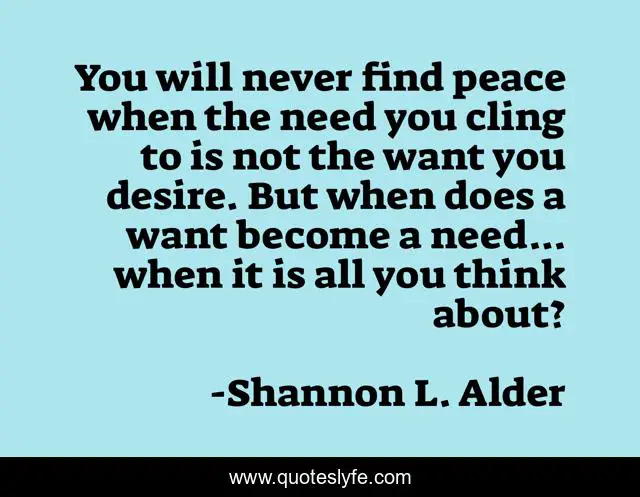 This page presents the quote "You will never find peace when the need you cling to is not the want you desire. But when does a want become a need... when it is all you think about?". Author of this quote is Shannon L. Alder. This quote is about wants, needs, dreams, need-you,.