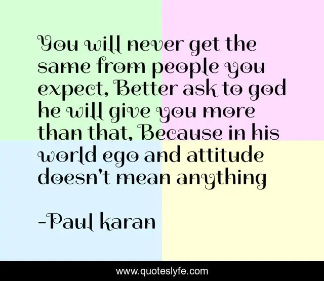 This page presents the quote "You will never get the same from people you expect, Better ask to god he will give you more than that, Because in his world ego and attitude doesn't mean anything". Author of this quote is Paul karan. This quote is about behaviour, god, attitude, ego,.