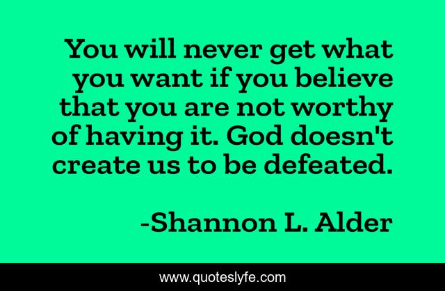 This page presents the quote "You will never get what you want if you believe that you are not worthy of having it. God doesn't create us to be defeated.". Author of this quote is Shannon L. Alder. This quote is about courage, faith, confidence, dream-big, success, rise-up, big-dreams, achieving, winners,.