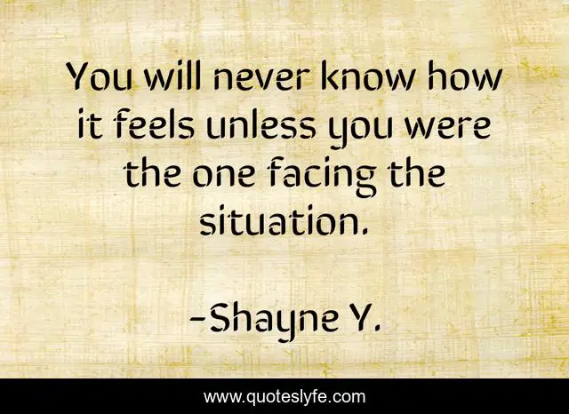 This page presents the quote "You will never know how it feels unless you were the one facing the situation.". Author of this quote is Shayne Y.. This quote is about enthusiasm, reality-of-life, inspirational,.