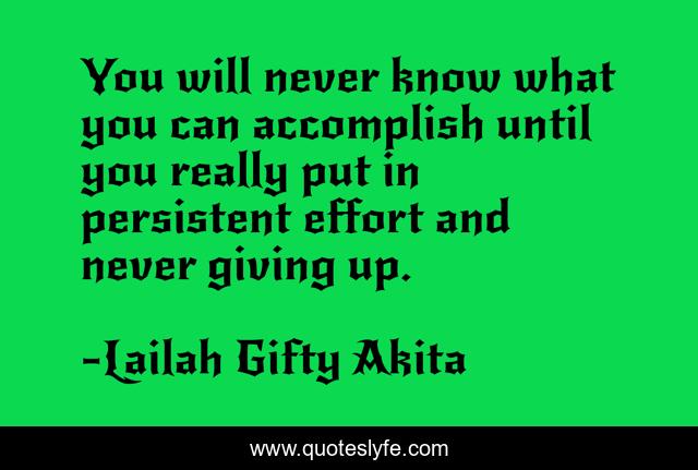 This page presents the quote "You will never know what you can accomplish until you really put in persistent effort and never giving up.". Author of this quote is Lailah Gifty Akita. This quote is about accomplish, accomplish-the-impossible, never-giving-up, persist, persistent, accomplish-great-things, accomplishments, persistent-action, persistent-effort,.