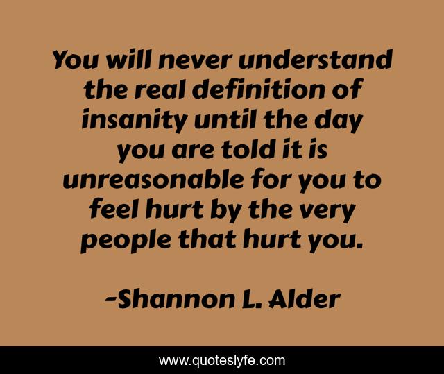 This page presents the quote "You will never understand the real definition of insanity until the day you are told it is unreasonable for you to feel hurt by the very people that hurt you.". Author of this quote is Shannon L. Alder. This quote is about tsloama, hurt, pain, insanity,.