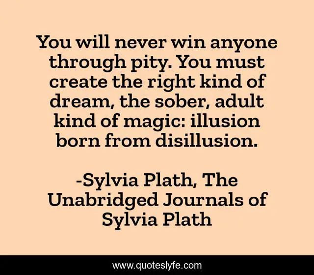 This page presents the quote "You will never win anyone through pity. You must create the right kind of dream, the sober, adult kind of magic: illusion born from disillusion.". Author of this quote is Sylvia Plath, The Unabridged Journals of Sylvia Plath. This quote is about disillusionment, adulthood, magic, dreams,.