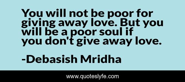This page presents the quote "You will not be poor for giving away love. But you will be a poor soul if you don't give away love.". Author of this quote is Debasish Mridha. This quote is about life, love, knowledge, inspirational, intelligence, philosophy, wisdom, quotes, affection,.