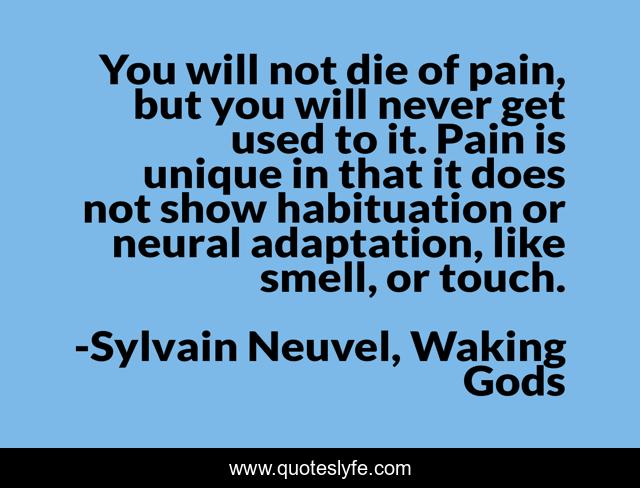 This page presents the quote "You will not die of pain, but you will never get used to it. Pain is unique in that it does not show habituation or neural adaptation, like smell, or touch.". Author of this quote is Sylvain Neuvel, Waking Gods. .