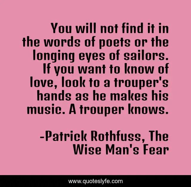 This page presents the quote "You will not find it in the words of poets or the longing eyes of sailors. If you want to know of love, look to a trouper's hands as he makes his music. A trouper knows.". Author of this quote is Patrick Rothfuss, The Wise Man's Fear. This quote is about trouper, love, musician, music, affection,.