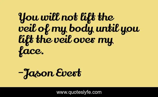 This page presents the quote "You will not lift the veil of my body until you lift the veil over my face.". Author of this quote is Jason Evert. This quote is about catholic, modesty, christian, chastity, inspirational, authenticity, love, epic, real-love,.