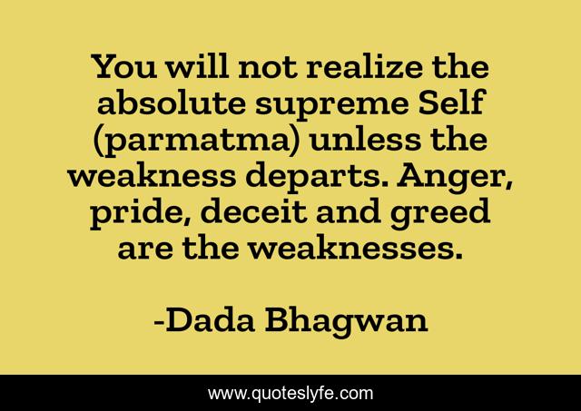 This page presents the quote "You will not realize the absolute supreme Self (parmatma) unless the weakness departs. Anger, pride, deceit and greed are the weaknesses.". Author of this quote is Dada Bhagwan. This quote is about anger, departs, spiritual, absolute,.