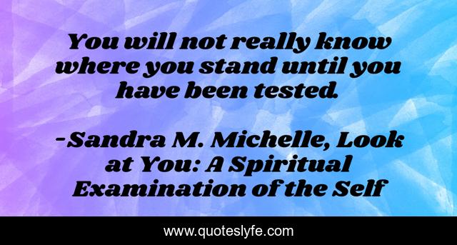 This page presents the quote "You will not really know where you stand until you have been tested.". Author of this quote is Sandra M. Michelle, Look at You: A Spiritual Examination of the Self. This quote is about reflection-on-life, self-realization, self-awareness,.