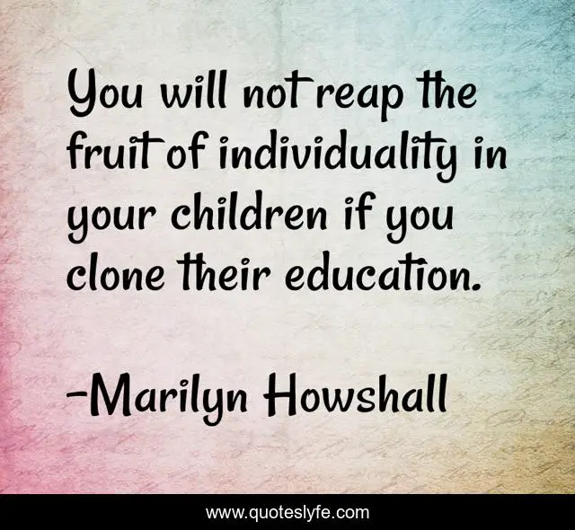 This page presents the quote "You will not reap the fruit of individuality in your children if you clone their education.". Author of this quote is Marilyn Howshall. This quote is about homeschooling, homeschool, education, learning,.