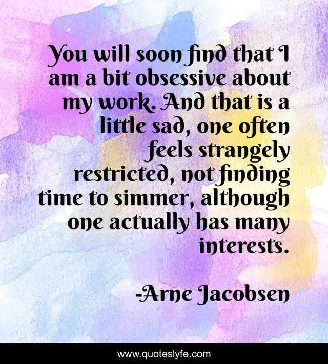 This page presents the quote "You will soon find that I am a bit obsessive about my work. And that is a little sad, one often feels strangely restricted, not finding time to simmer, although one actually has many interests.". Author of this quote is Arne Jacobsen. This quote is about work, time,.