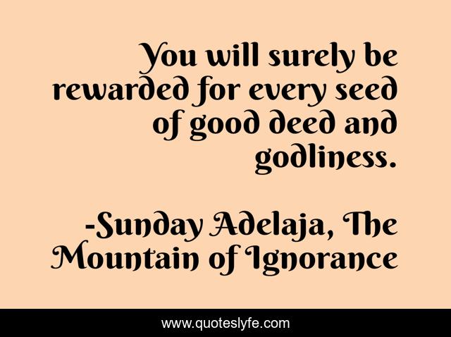 This page presents the quote "You will surely be rewarded for every seed of good deed and godliness.". Author of this quote is Sunday Adelaja, The Mountain of Ignorance. This quote is about mountain, life, good-deeds, darkness, power, danger, god, people, ignorance,.