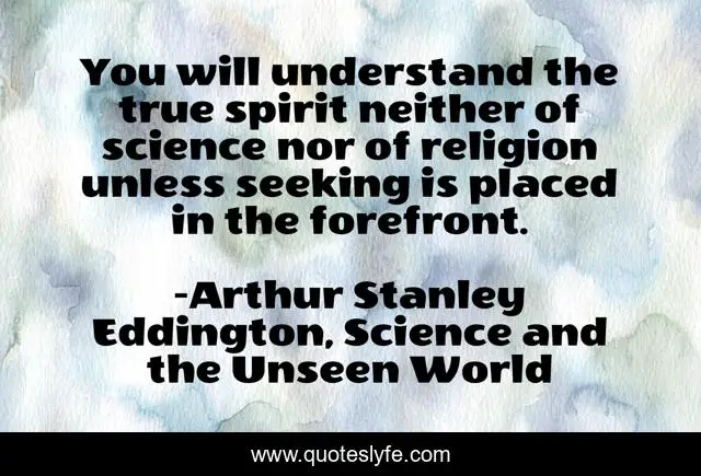 This page presents the quote "You will understand the true spirit neither of science nor of religion unless seeking is placed in the forefront.". Author of this quote is Arthur Stanley Eddington, Science and the Unseen World. This quote is about truth-seeking, science, pursuit-of-knowledge, religion,.