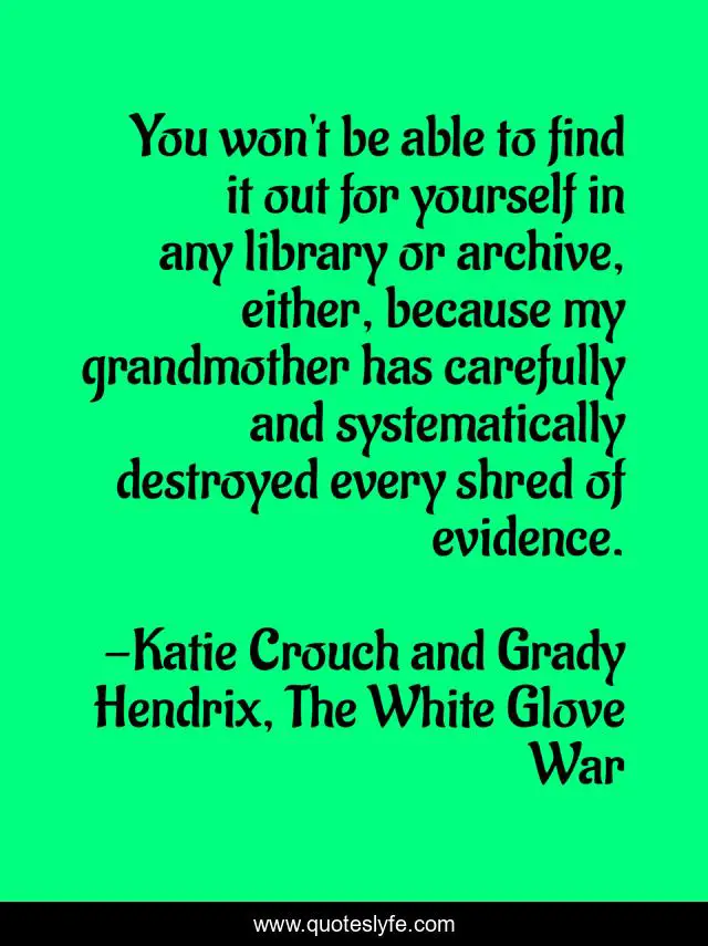 This page presents the quote "You won't be able to find it out for yourself in any library or archive, either, because my grandmother has carefully and systematically destroyed every shred of evidence.". Author of this quote is Katie Crouch and Grady Hendrix, The White Glove War. This quote is about romance, magic, suspense, darkness,.