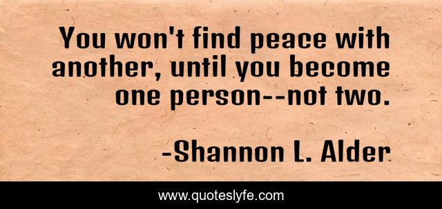 This page presents the quote "You won't find peace with another, until you become one person--not two.". Author of this quote is Shannon L. Alder. This quote is about socrates, made-of-this, dreams, peaceful-warrior, authenticity,.