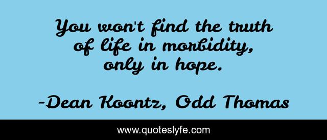 This page presents the quote "You won't find the truth of life in morbidity, only in hope.". Author of this quote is Dean Koontz, Odd Thomas. This quote is about life, hope, truth,.