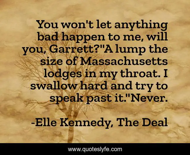 This page presents the quote "You won't let anything bad happen to me, will you, Garrett?"A lump the size of Massachusetts lodges in my throat. I swallow hard and try to speak past it."Never.". Author of this quote is Elle Kennedy, The Deal. .