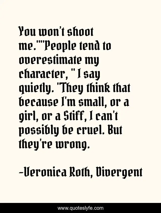 This page presents the quote "You won’t shoot me.""People tend to overestimate my character, " I say quietly. "They think that because I’m small, or a girl, or a Stiff, I can’t possibly be cruel. But they’re wrong.". Author of this quote is Veronica Roth, Divergent. This quote is about strong-women, female-characters, female-empowerment, feminism,.