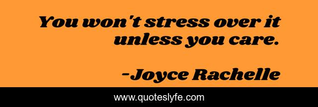 This page presents the quote "You won't stress over it unless you care.". Author of this quote is Joyce Rachelle. This quote is about caring, stress, anxiety, thinking, stressing, stress-relief, anxious, rumination, ruminating,.