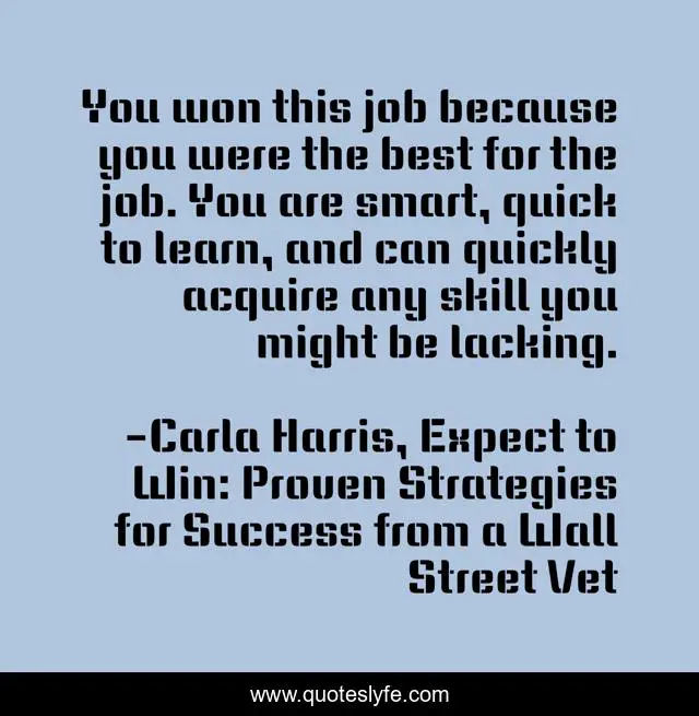 This page presents the quote "You won this job because you were the best for the job. You are smart, quick to learn, and can quickly acquire any skill you might be lacking.". Author of this quote is Carla Harris, Expect to Win: Proven Strategies for Success from a Wall Street Vet. This quote is about interviews, leadership,.