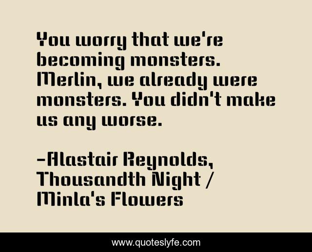 This page presents the quote "You worry that we're becoming monsters. Merlin, we already were monsters. You didn't make us any worse.". Author of this quote is Alastair Reynolds, Thousandth Night / Minla's Flowers. .