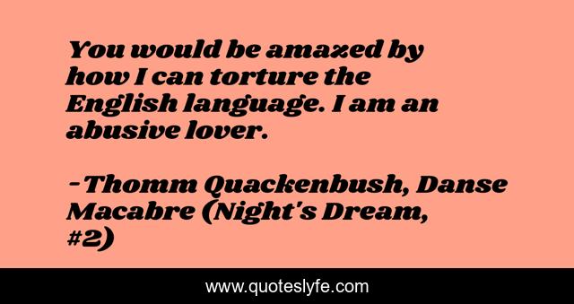 This page presents the quote "You would be amazed by how I can torture the English language. I am an abusive lover.". Author of this quote is Thomm Quackenbush, Danse Macabre (Night's Dream, #2). This quote is about abusive, english, language, lover,.